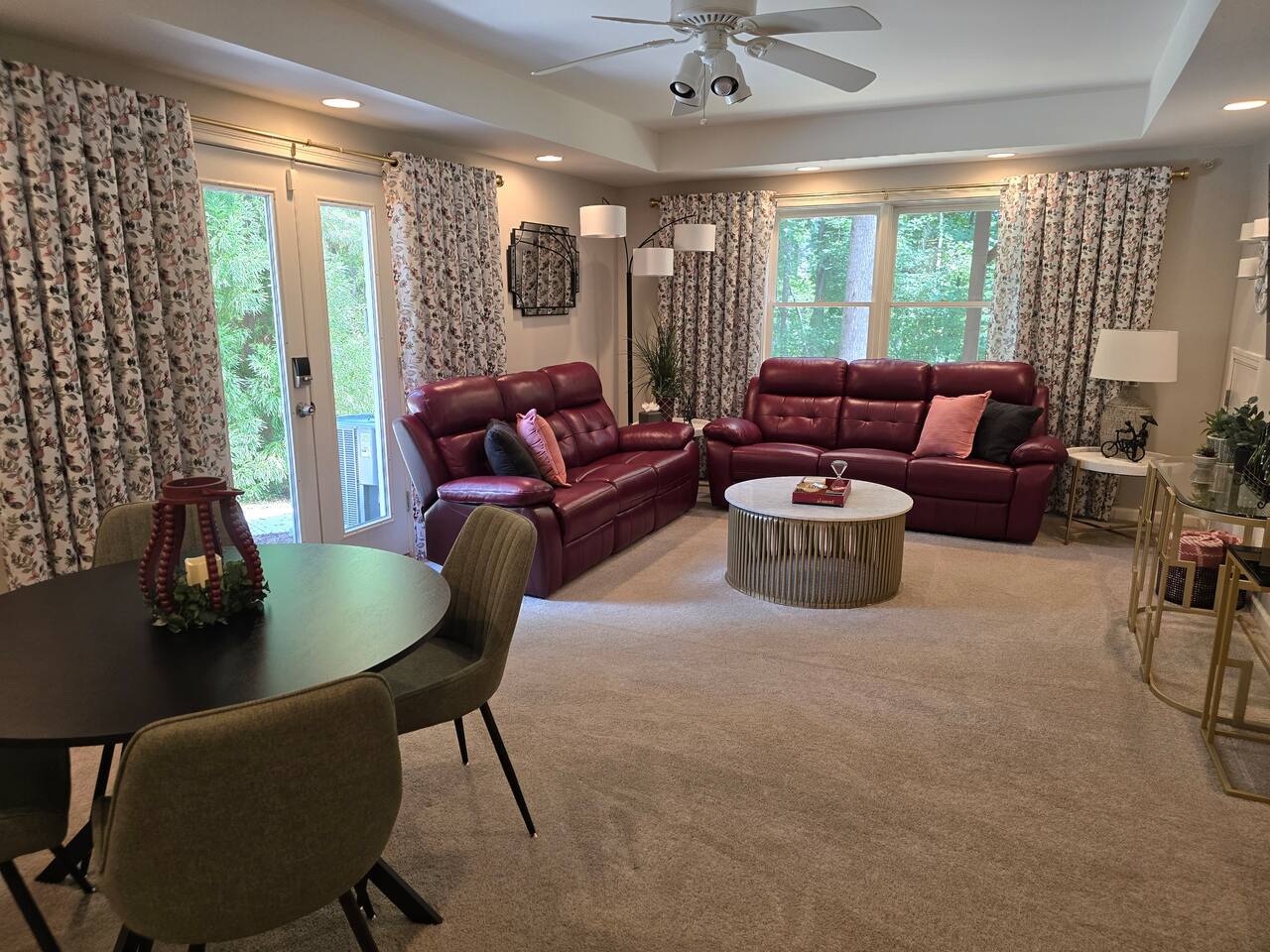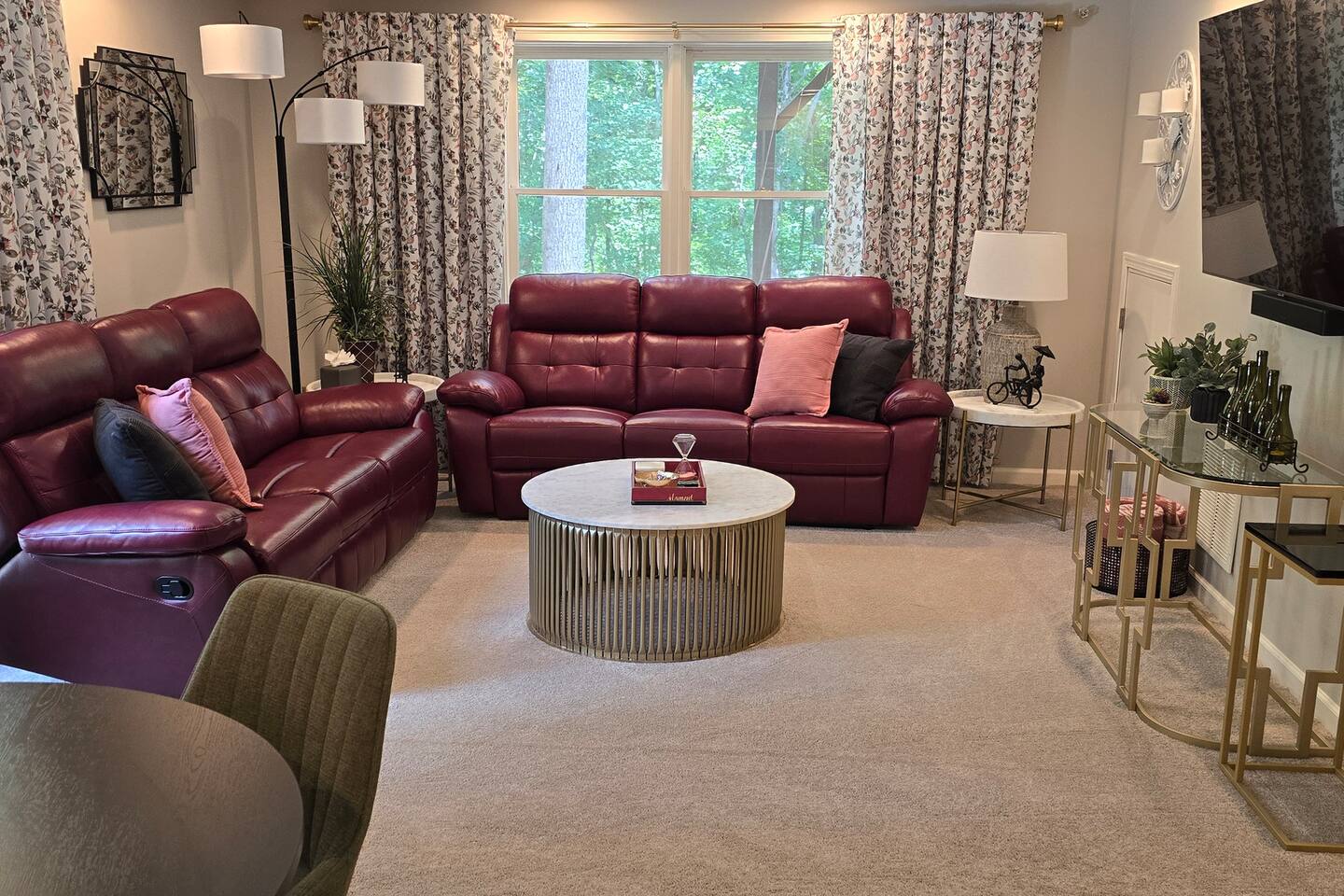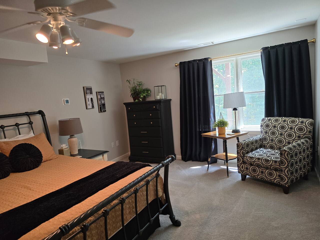 Welcome to your serene 1385 sq ft basement apartment with your private entrance & parking. You can enjoy the beautiful outdoor space overlooking the trees and creek. There is a lovely living/dining room with a 65" Smart TV, spacious bedroom, dressing room office combo, laundry room, kitchenette with an 8-in-1 oven, full refrigerator, and induction cook plate, and coffee maker. You will find a well-stocked kitchen with pots & pans, dishes & tools. There is a bonus bedroom with two twin beds.