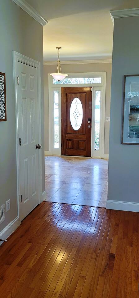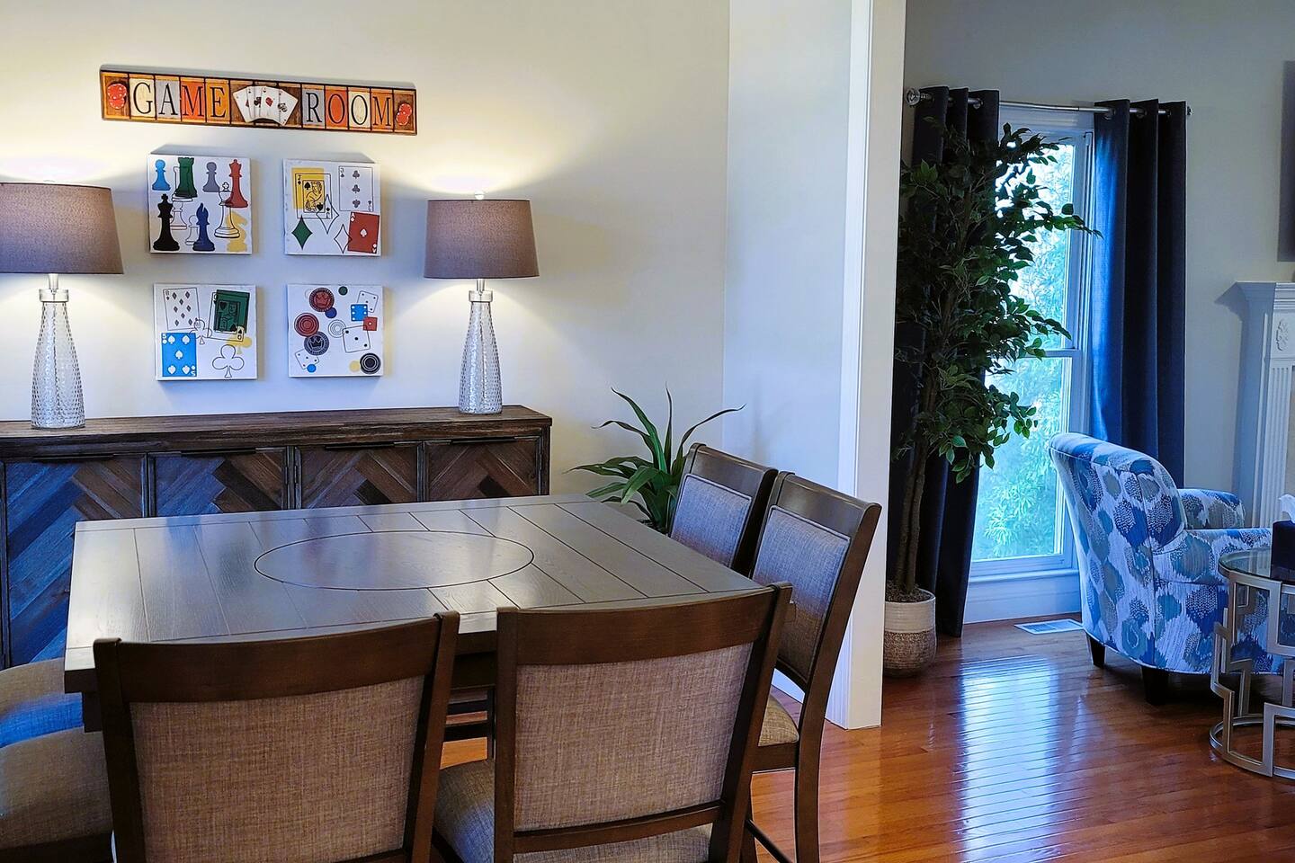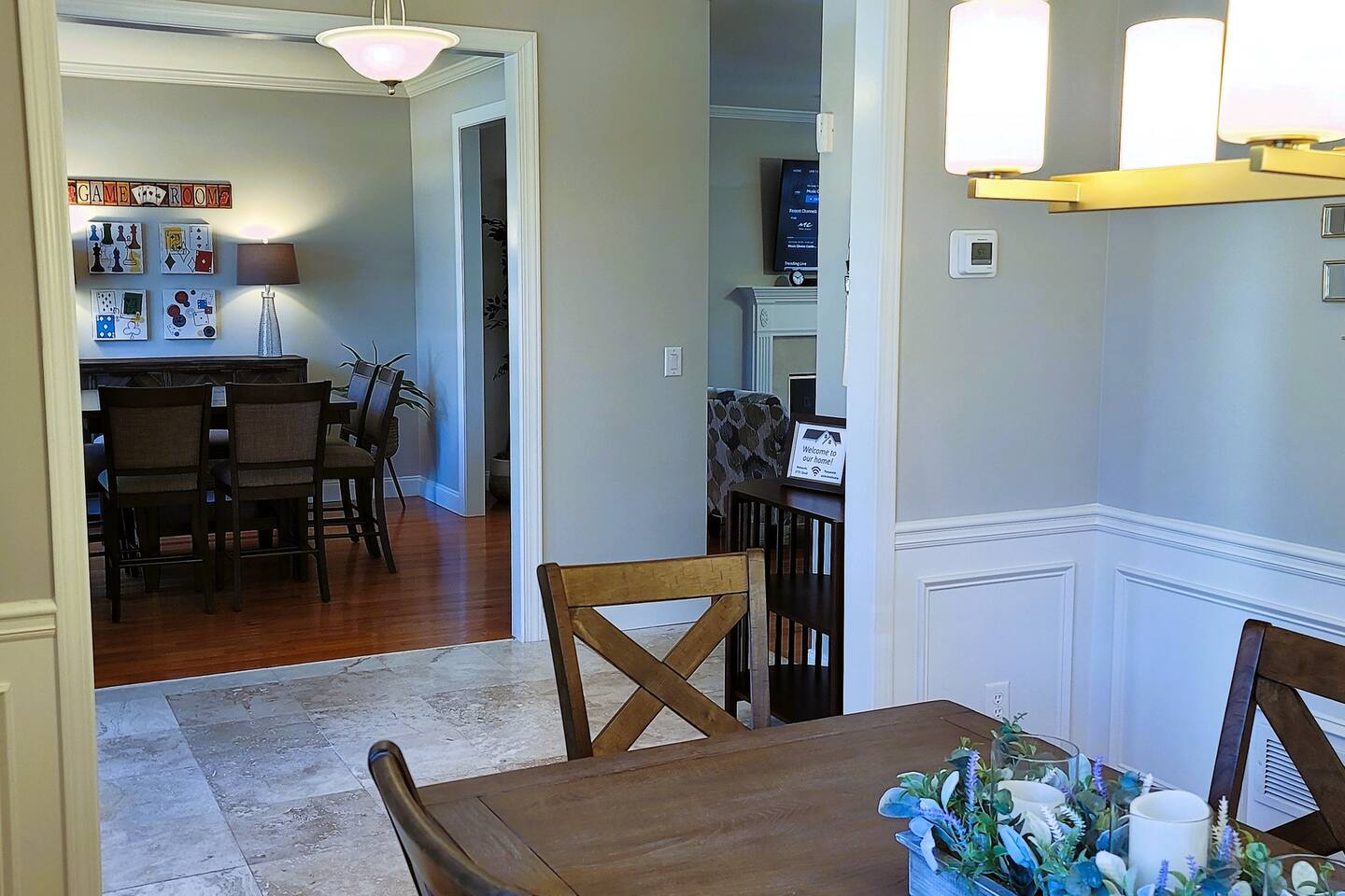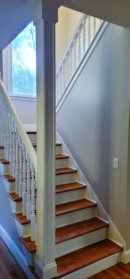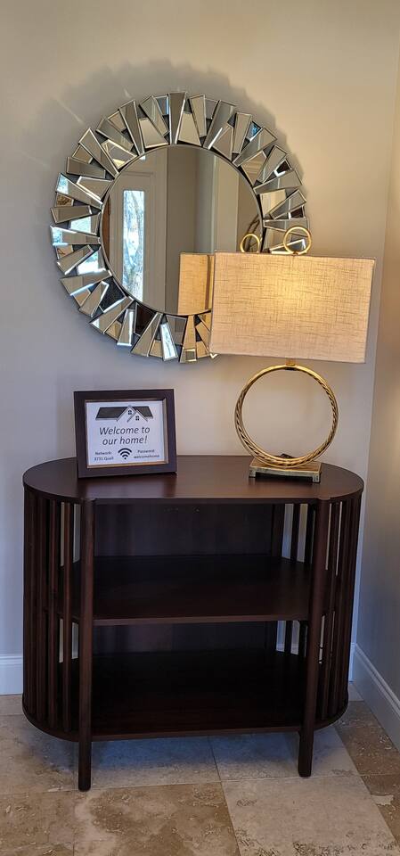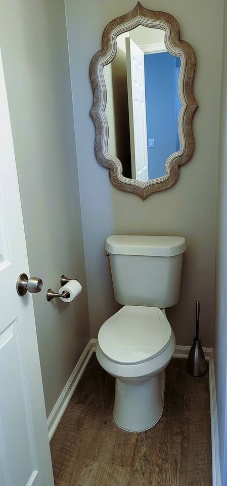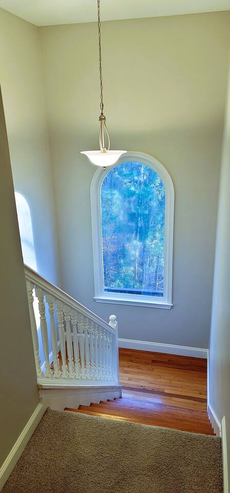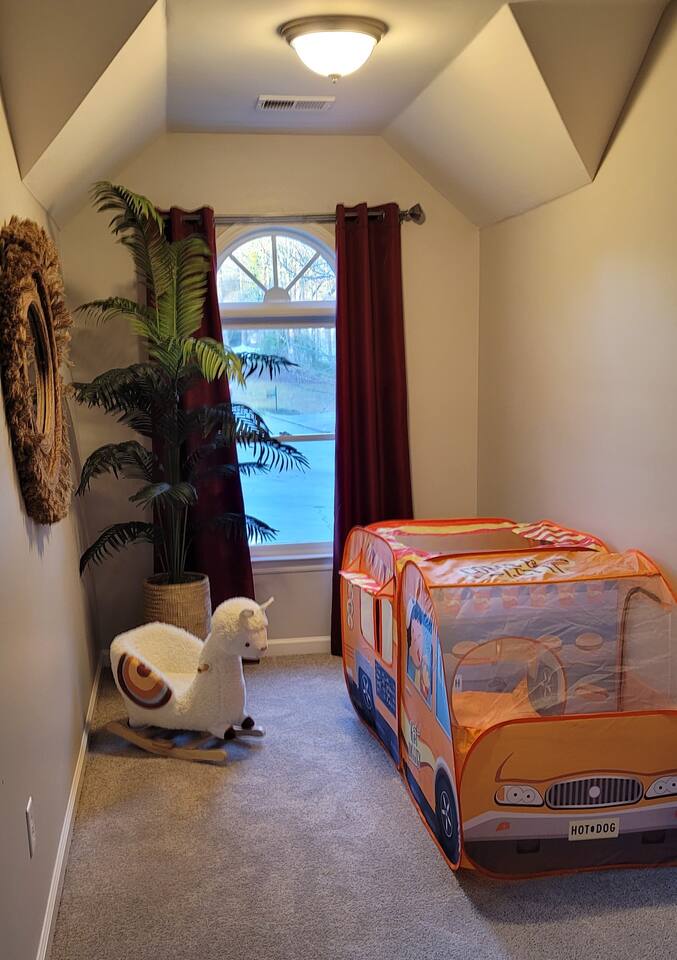 This wonderful home provides you with two full floors of spacious comfort. The first floor is the main hangout area featuring a living room with a gas fireplace for the cooler months. There is a game room stocked with all of our favorites. Of course, there is the kitchen. This one is very well stocked and connects to the eat-in area for casual and the formal dining room for more upscale meals. There is also a convenient half bath. Don't forget the roomy 10' x 20' rear deck overlooking the lovely woods and creek. It features an outdoor dining set and conversation area along with a big ol' barbeque grill. All bedrooms are on the second floor. It features an enormous primary room with a king bed and bath which includes a large office area as well as a cozy sitting/reading space. The "Mint" queen bedroom is attached to the upstairs full bath. It has a wonderful view of the woods behind the house and features a walk-in closet. The other two bedrooms have access to the bathroom from the hallway. The other queen guest room "The Florida Room" is across the hall. It features a beautiful cherrywood bedroom suite and also hosts a walk-in closet. At the end of the hall, you'll find "Kid Central" or the bunk room. It features two awesome bunk bed towers, and a big screen for their viewing fun, or for connecting their game console. There is also a great play area for the little ones at the other end of the room, featuring their very own food truck. Ok, so it's really just a tent, but they'll LOVE it. They'll also find additional toys and playthings in the walk-in closet. There is a garage available for your convenience. That kind of sounds boring compared to the rest of the home. There is a basement apartment that can also be utilized if you have a larger gathering. We do not allow parties as we have neighbors who want to keep the neighborhood pristine and quiet. The basement apartment may or may not be hosting other guests when you come to stay. It has its parking area on the left side of the circular driveway and a private entrance on the left side of the home. Usually, when we stay at the house, we never see the basement guests coming or going. We added soundproofing in the basement ceiling and staircase to hopefully prevent sounds from going between the two units. Here is the link if you would like to utilize that unit too: https://www.airbnb.com/rooms/1069591213665676854