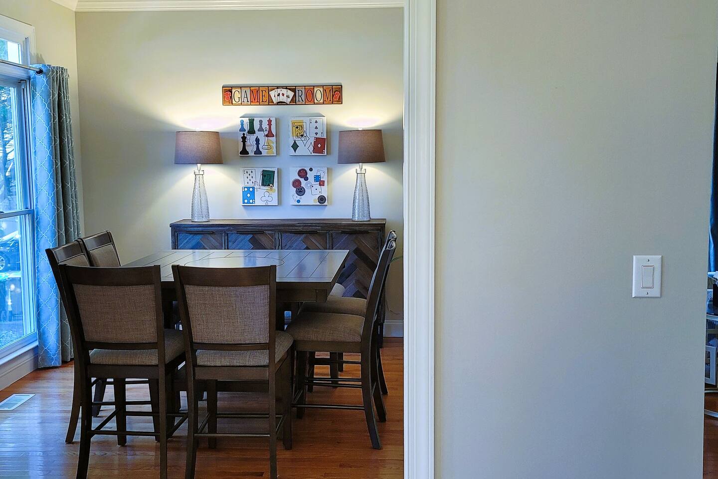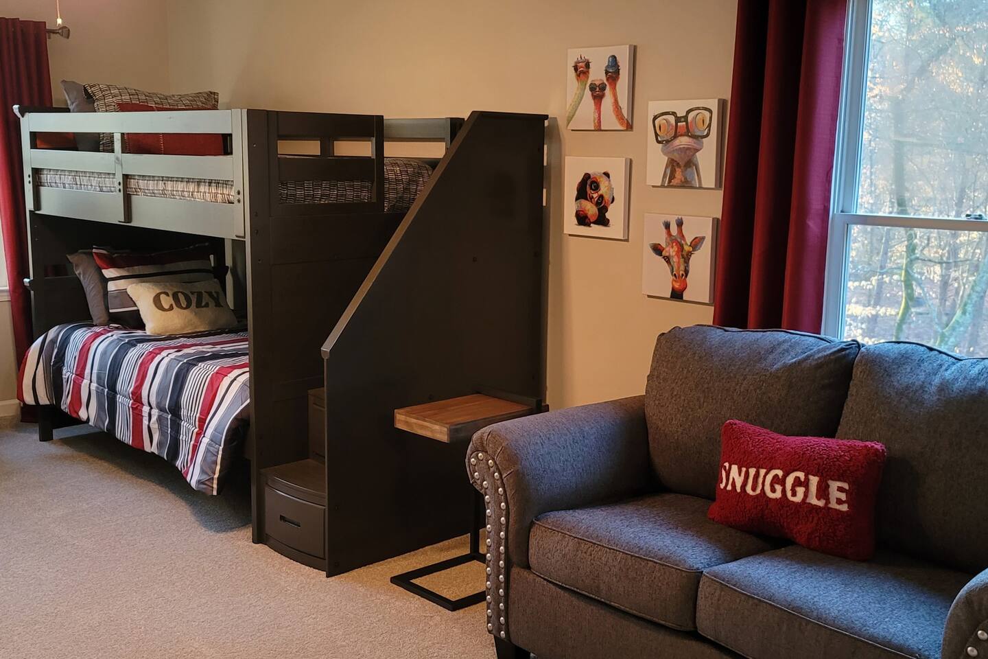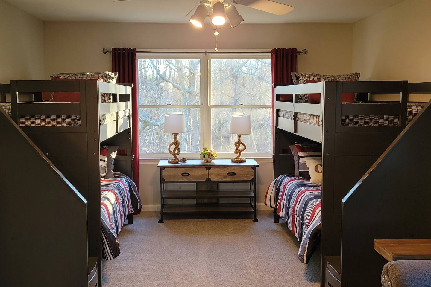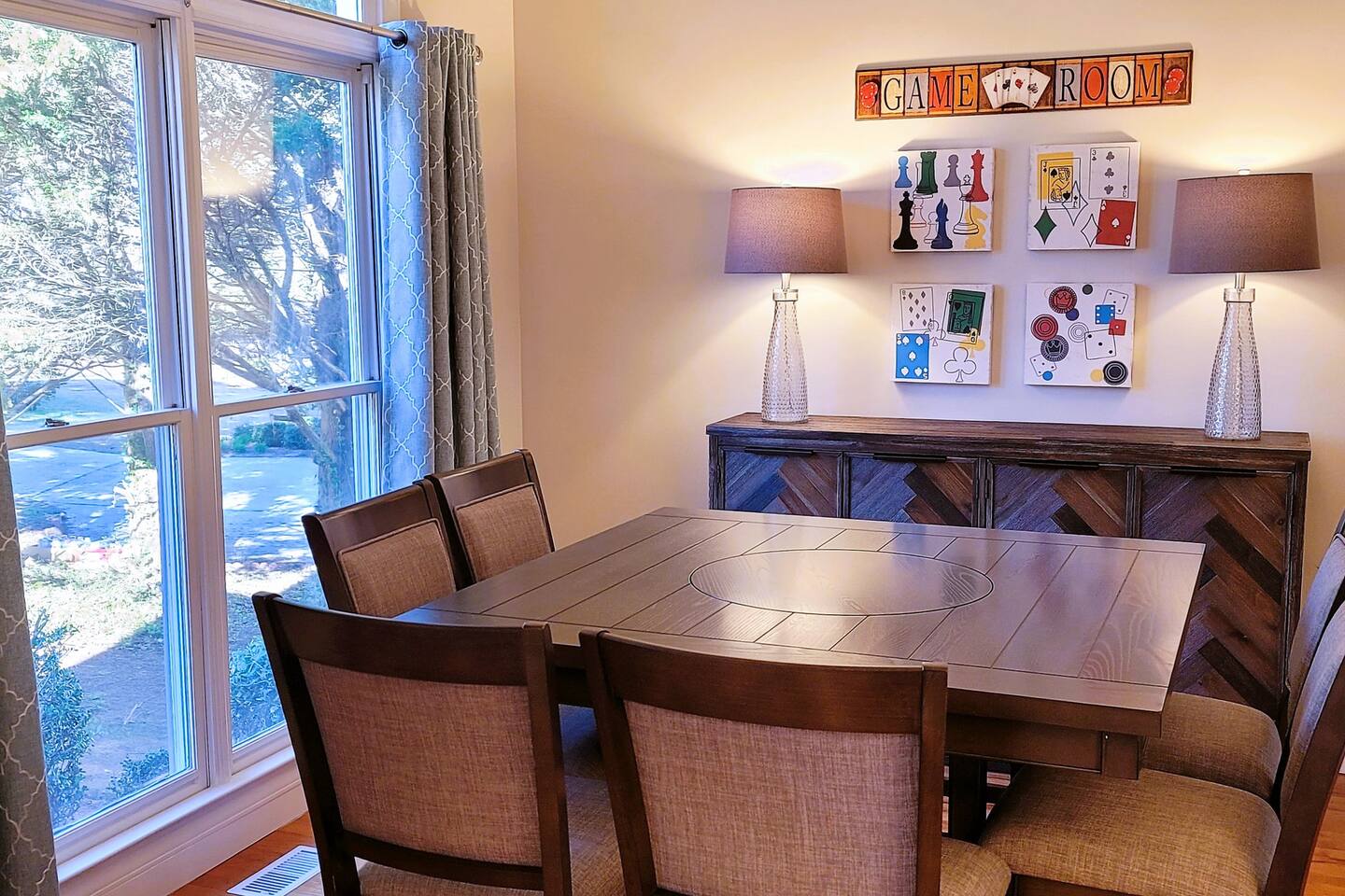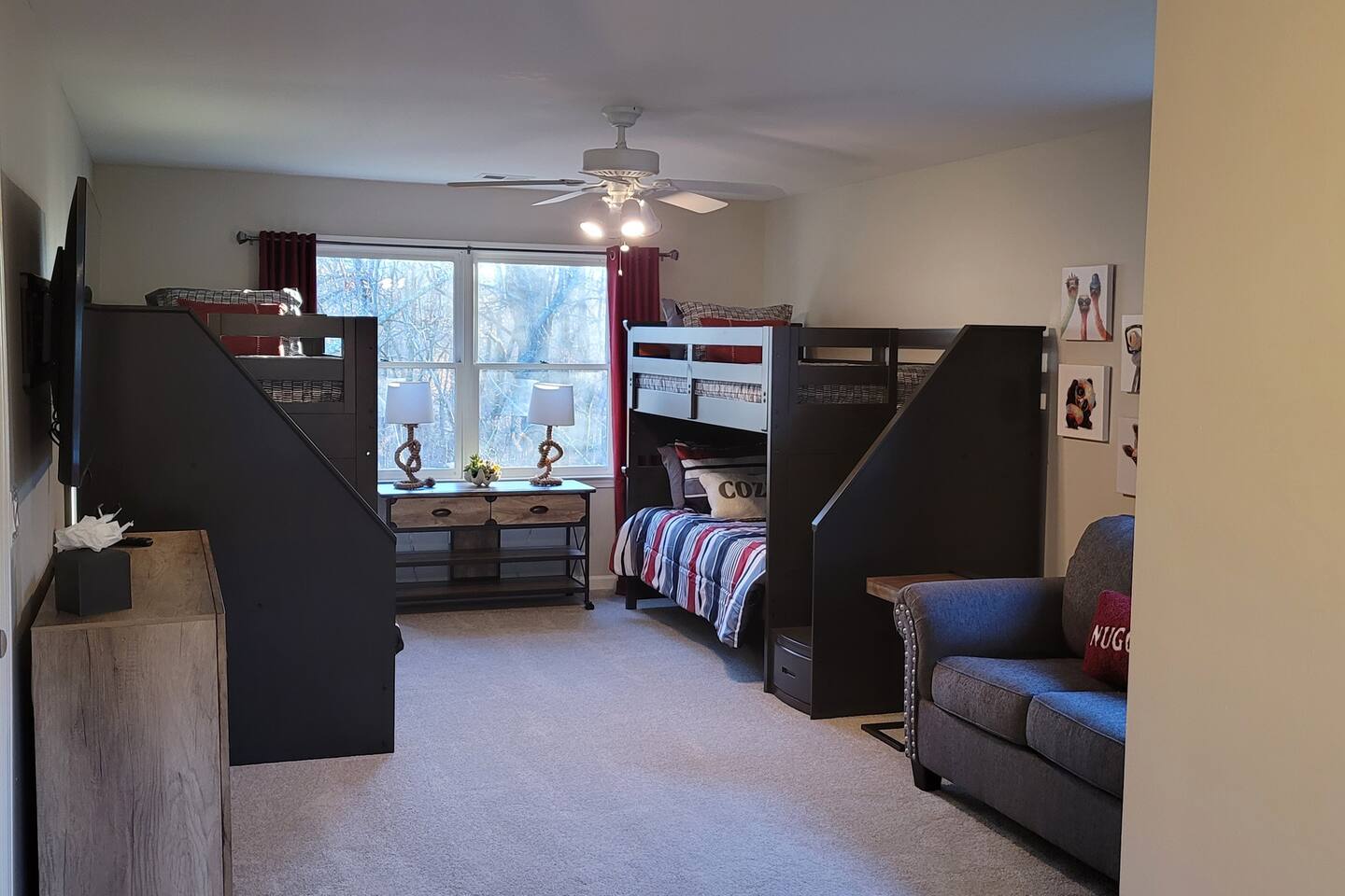 This wonderful home provides you with two full floors of spacious comfort. The first floor is the main hangout area featuring a living room with a gas fireplace for the cooler months. There is a game room stocked with all of our favorites. Of course, there is the kitchen. This one is very well stocked and connects to the eat-in area for casual and the formal dining room for more upscale meals. There is also a convenient half bath. Don't forget the roomy 10' x 20' rear deck overlooking the lovely woods and creek. It features an outdoor dining set and conversation area along with a big ol' barbeque grill. All bedrooms are on the second floor. It features an enormous primary room with a king bed and bath which includes a large office area as well as a cozy sitting/reading space. The "Mint" queen bedroom is attached to the upstairs full bath. It has a wonderful view of the woods behind the house and features a walk-in closet. The other two bedrooms have access to the bathroom from the hallway. The other queen guest room "The Florida Room" is across the hall. It features a beautiful cherrywood bedroom suite and also hosts a walk-in closet. At the end of the hall, you'll find "Kid Central" or the bunk room. It features two awesome bunk bed towers, and a big screen for their viewing fun, or for connecting their game console. There is also a great play area for the little ones at the other end of the room, featuring their very own food truck. Ok, so it's really just a tent, but they'll LOVE it. They'll also find additional toys and playthings in the walk-in closet. There is a garage available for your convenience. That kind of sounds boring compared to the rest of the home. There is a basement apartment that can also be utilized if you have a larger gathering. We do not allow parties as we have neighbors who want to keep the neighborhood pristine and quiet. The basement apartment may or may not be hosting other guests when you come to stay. It has its parking area on the left side of the circular driveway and a private entrance on the left side of the home. Usually, when we stay at the house, we never see the basement guests coming or going. We added soundproofing in the basement ceiling and staircase to hopefully prevent sounds from going between the two units. Here is the link if you would like to utilize that unit too: https://www.airbnb.com/rooms/1069591213665676854