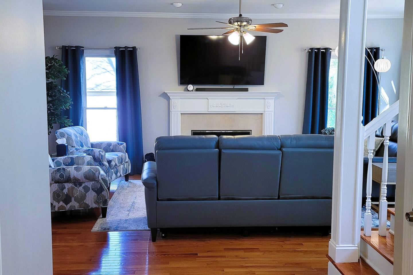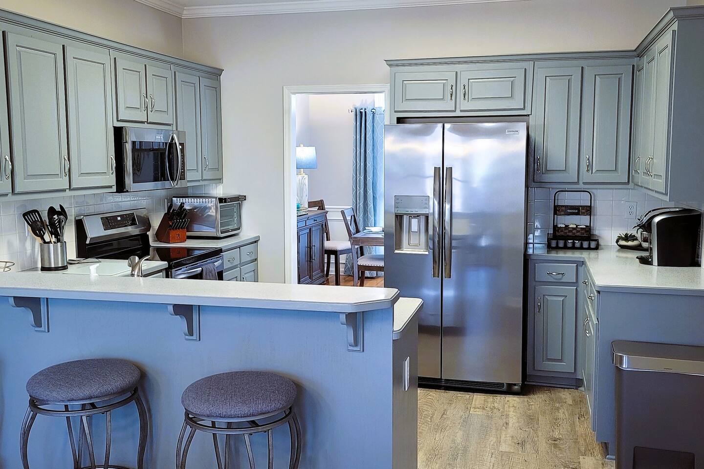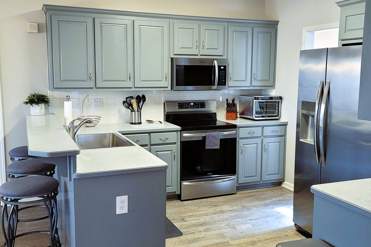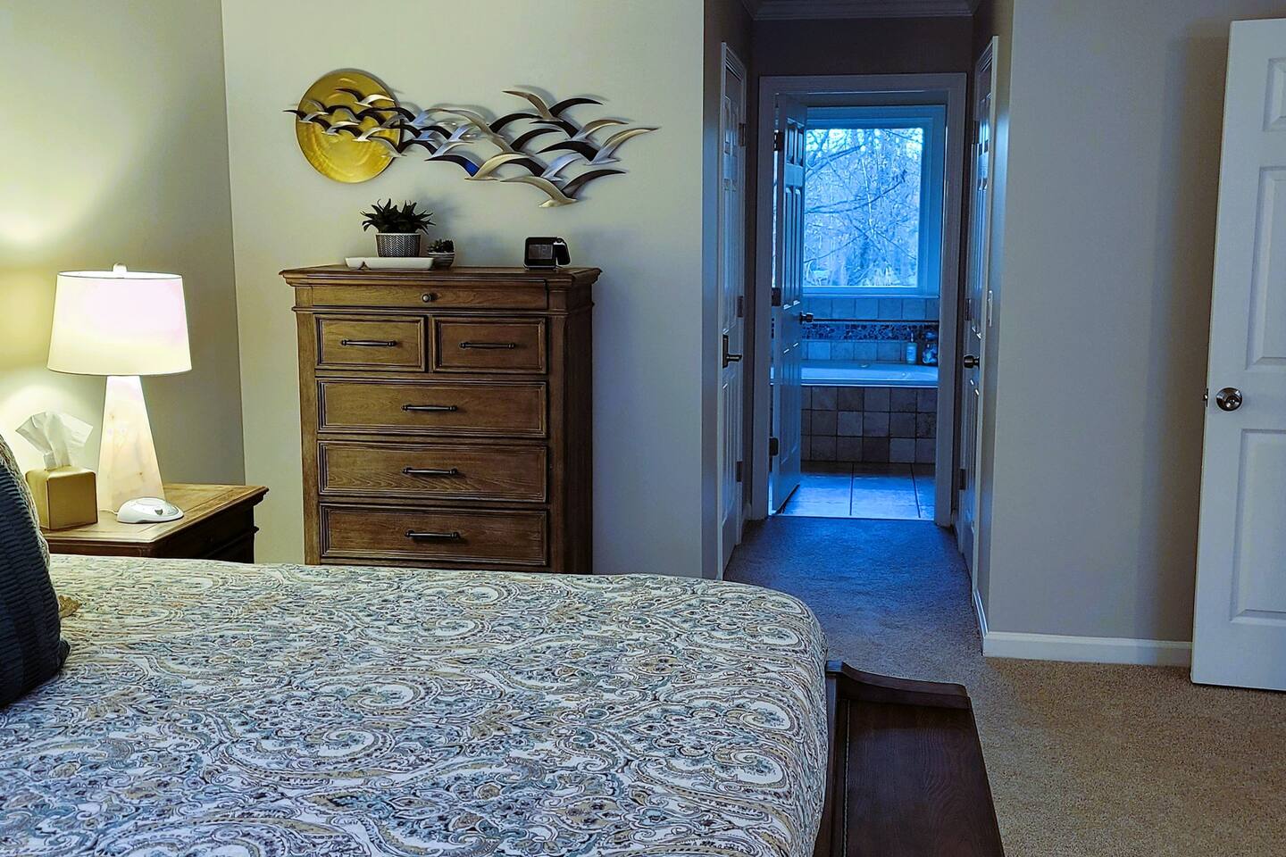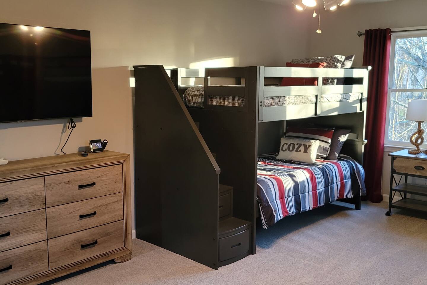 This wonderful home provides you with two full floors of spacious comfort. The first floor is the main hangout area featuring a living room with a gas fireplace for the cooler months. There is a game room stocked with all of our favorites. Of course, there is the kitchen. This one is very well stocked and connects to the eat-in area for casual and the formal dining room for more upscale meals. There is also a convenient half bath. Don't forget the roomy 10' x 20' rear deck overlooking the lovely woods and creek. It features an outdoor dining set and conversation area along with a big ol' barbeque grill. All bedrooms are on the second floor. It features an enormous primary room with a king bed and bath which includes a large office area as well as a cozy sitting/reading space. The "Mint" queen bedroom is attached to the upstairs full bath. It has a wonderful view of the woods behind the house and features a walk-in closet. The other two bedrooms have access to the bathroom from the hallway. The other queen guest room "The Florida Room" is across the hall. It features a beautiful cherrywood bedroom suite and also hosts a walk-in closet. At the end of the hall, you'll find "Kid Central" or the bunk room. It features two awesome bunk bed towers, and a big screen for their viewing fun, or for connecting their game console. There is also a great play area for the little ones at the other end of the room, featuring their very own food truck. Ok, so it's really just a tent, but they'll LOVE it. They'll also find additional toys and playthings in the walk-in closet. There is a garage available for your convenience. That kind of sounds boring compared to the rest of the home. There is a basement apartment that can also be utilized if you have a larger gathering. We do not allow parties as we have neighbors who want to keep the neighborhood pristine and quiet. The basement apartment may or may not be hosting other guests when you come to stay. It has its parking area on the left side of the circular driveway and a private entrance on the left side of the home. Usually, when we stay at the house, we never see the basement guests coming or going. We added soundproofing in the basement ceiling and staircase to hopefully prevent sounds from going between the two units. Here is the link if you would like to utilize that unit too: https://www.airbnb.com/rooms/1069591213665676854